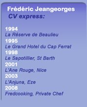Chef à Domicile, Luxury Yacht Service, Evénements Gastronomiques Plusieurs expériences passionnantes au sein d'établissements à la notoriété internationalement reconnue, parmi lesquels le Grand-Hôtel du Cap-Ferrat, la Réserve de Beaulieu, et durant cinq ans, L’Anjuna à Eze, permettent aujourd’hui au Chef Frédéric Jeangeorges de préparer une cuisine d'excellence, savoureuse et raffinée, selon vos goûts et vos envies. Lors d'une rencontre préalable, nous définissons ensemble le menu adapté afin d’établir un devis au meilleur coût et envisager le dispositif le plus efficace pour assurer la réussite de vos soirées et de vos événements. Par la suite nous effectuons les achats des ingrédients chez les fournisseurs les plus réputés de la Côte d’Azur, puis nous démarrons les préparatifs à votre domicile ou sur votre lieu de réception le jour même. Fredcooking est à-même de prendre en charge votre décoration de table et les diverses locations. Nous sommes à votre entière disposition pour créer ensemble des moments inoubliables. |
